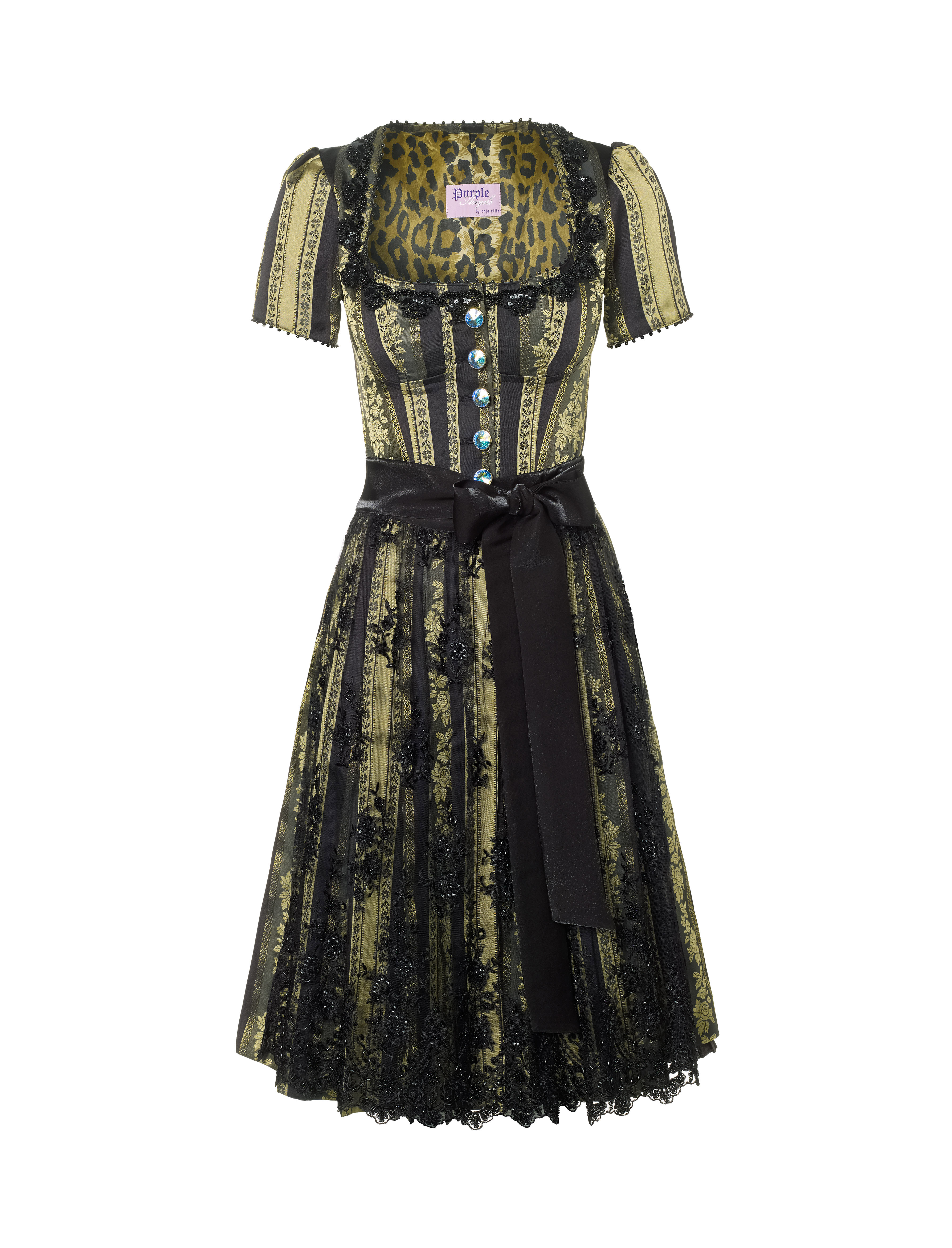 Seidenjaquard in schwarz-geldgold-lurex, Perlenpaspel in schwarz, schwarze Perlenbordüre